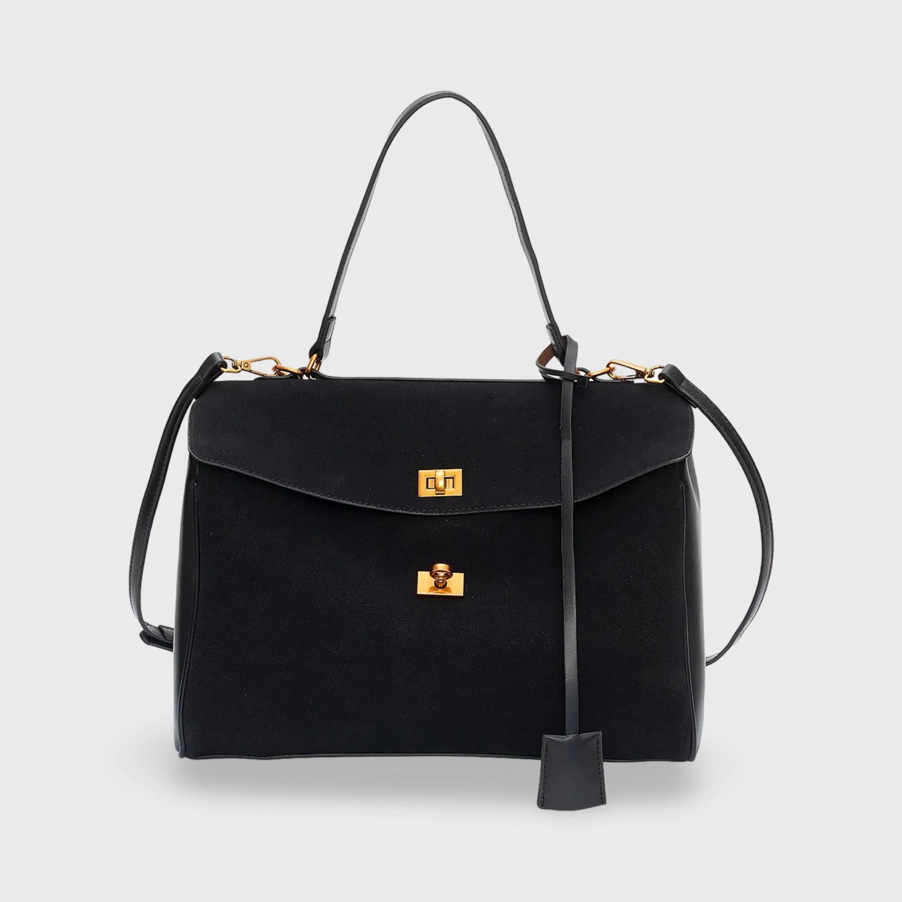Meet the Ciara Premium – A refined statement of modern elegance. Crafted with a harmonious blend of plush suede and premium vegan leather on the sides and back, this exquisite piece is elevated with gleaming gold hardware. Its versatile design transitions effortlessly between shoulder and crossbody wear, making it perfect for any occasion.