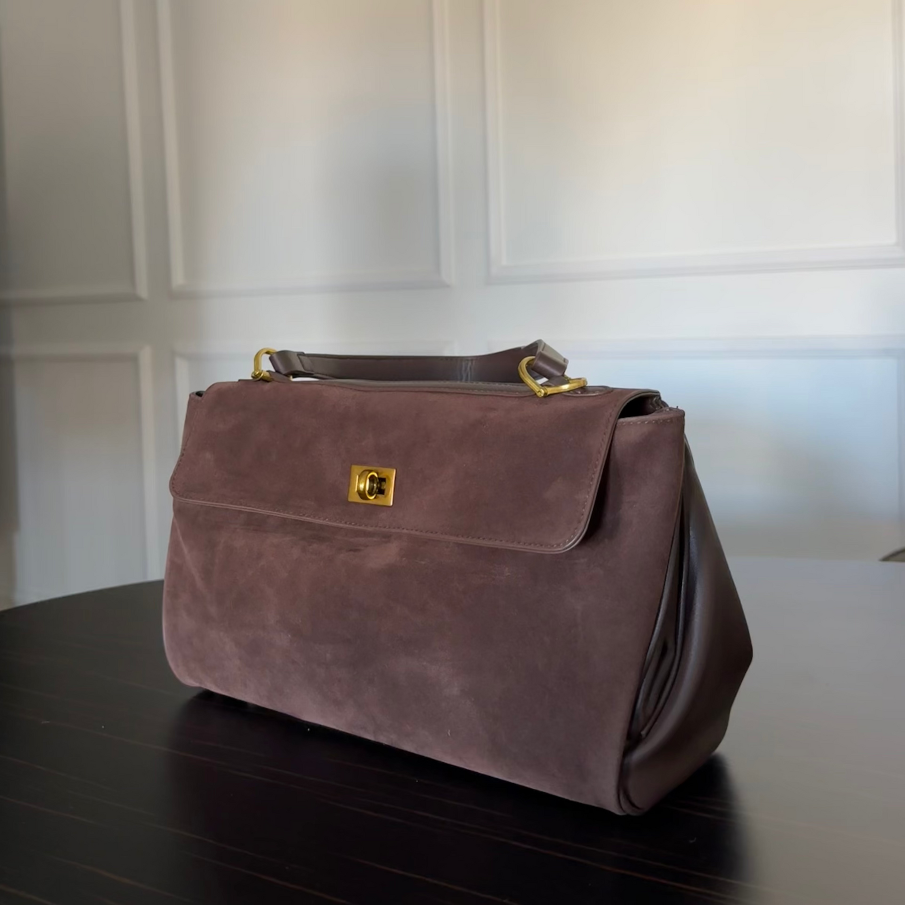 Crafted entirely from genuine leather, featuring a plush suede leather front and smooth leather sides and back, this exquisite piece is elevated with gleaming gold hardware. Its versatile design transitions effortlessly between shoulder and crossbody wear, making it perfect for any occasion.