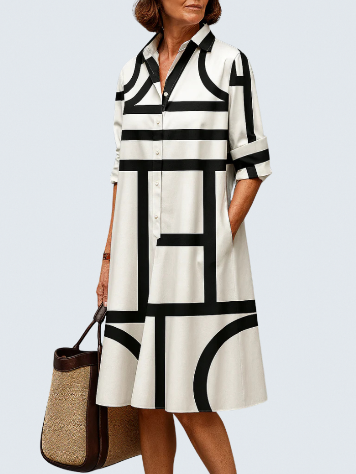 The Brigitte Dress makes a powerful statement through structure and simplicity. With its striking black geometric pattern on a soft ivory base, Brigitte is a masterclass in modern sophistication. Ideal for city strolls, creative workspaces, or stylish lunches, this dress brings effortless polish to your everyday wardrobe. Its classic shirt-dress silhouette is elevated with bold lines and clean symmetry, creating a look that’s architectural yet feminine. Brigitte offers a perfect blend of comfort, confidence, and quiet luxury—for women who love design-driven dressing that doesn’t try too hard.