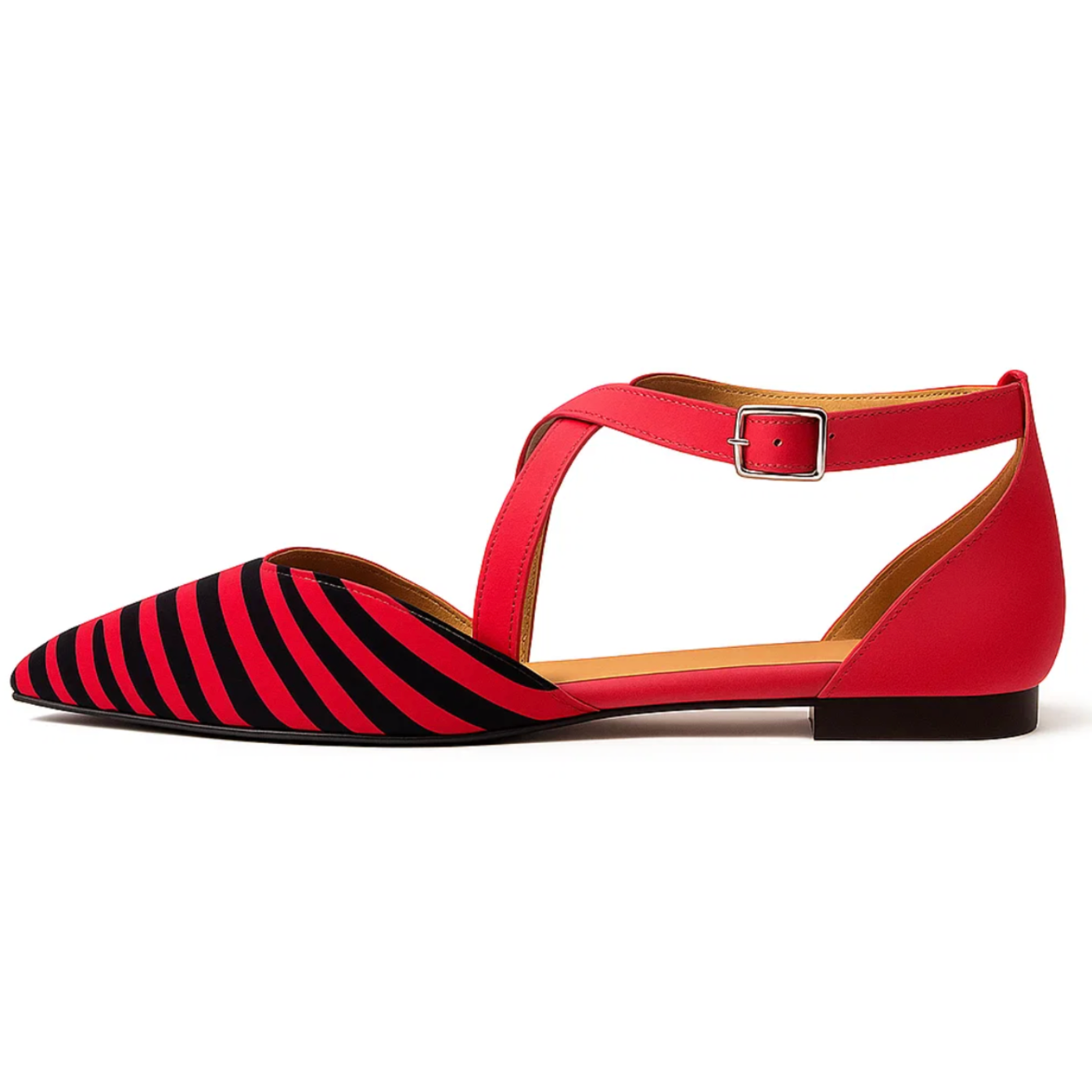 Let your outfit do the talking with the Zebra Chic Ballerina. These striking flats combine a bold zebra print with vibrant fuchsia suede straps that elegantly cross over the foot. The design is playful yet refined, perfect for women who love to make a statement with their style without compromising on comfort. The pointed toe and low heel give the shoe a feminine touch, ideal for both casual and semi-formal occasions.